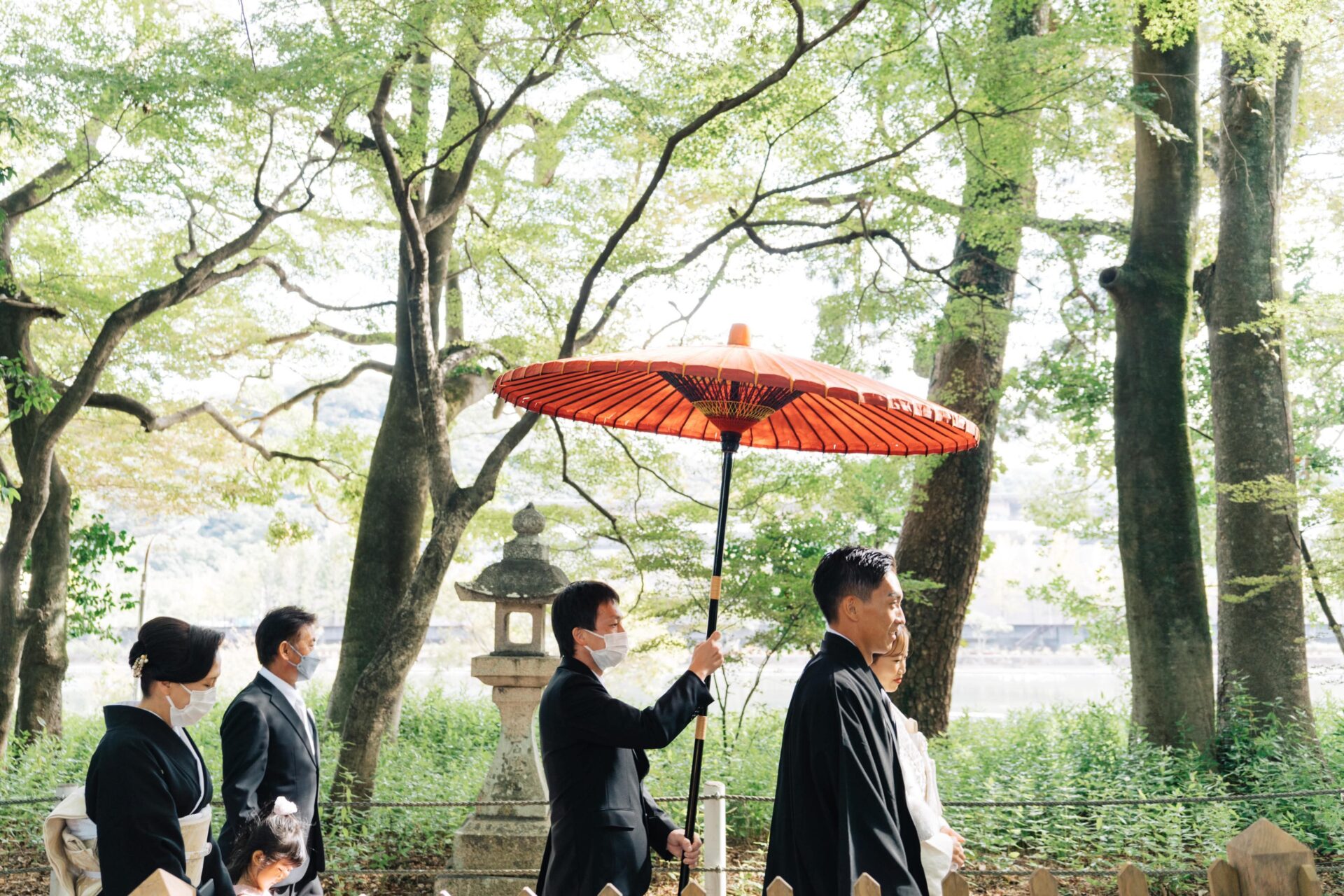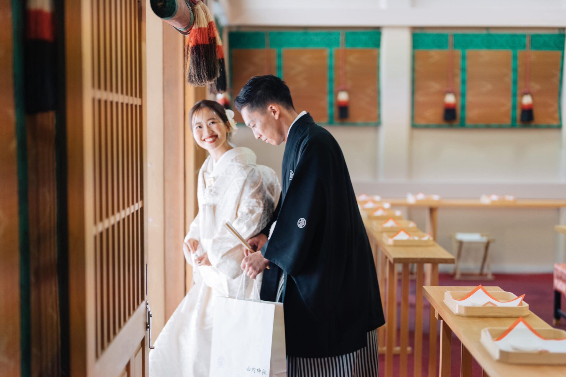 不安や葛藤を抱えながら迎えた結婚式当日。神前式は山内神社でとりおこないました。