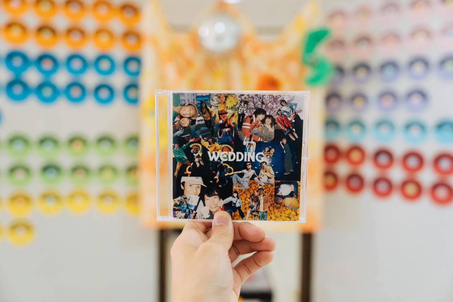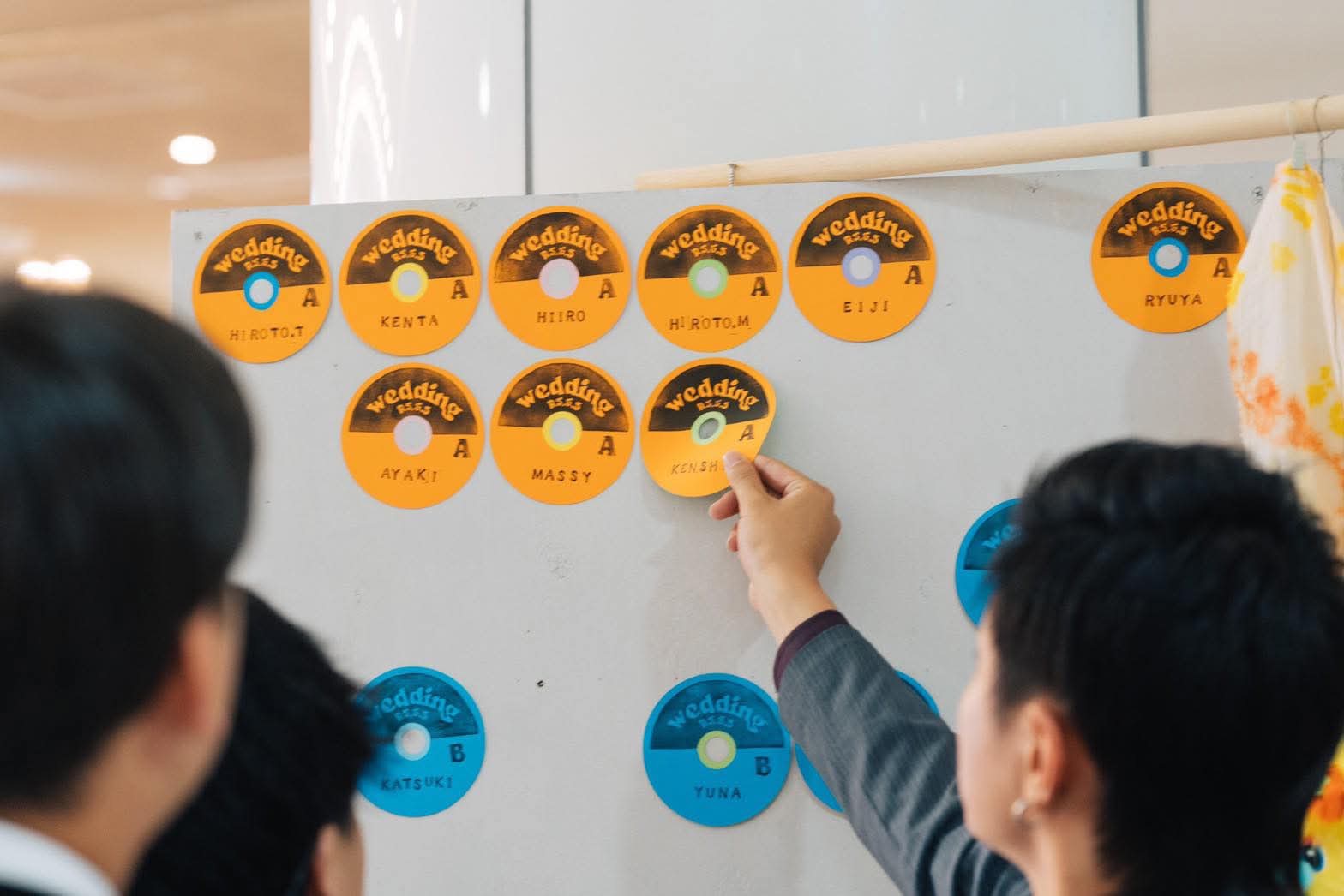 おふたりのウエルカムスペースにある、CD型のエスコートカードもおふたりの手作りです。