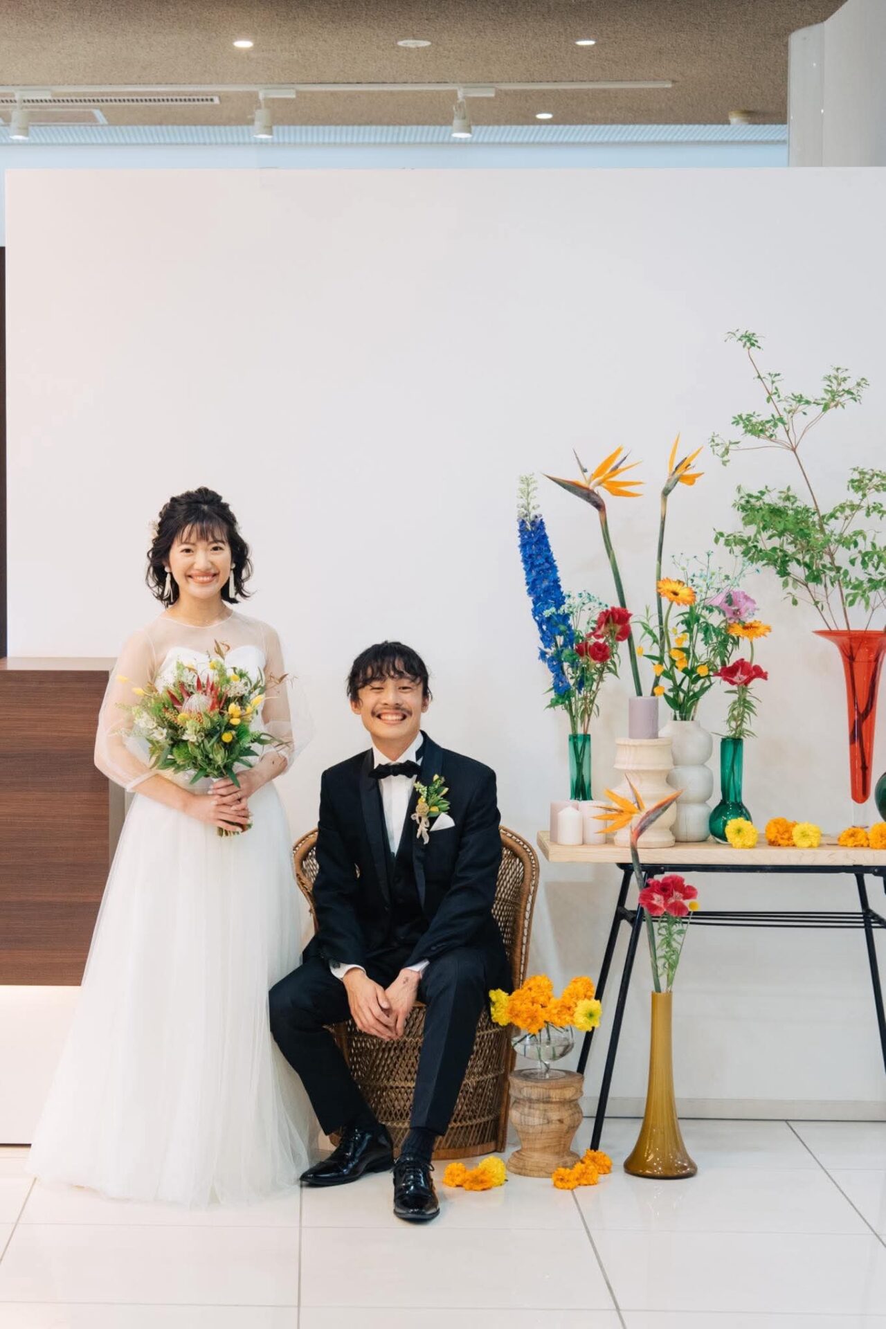 ウエルカムスペースは、“ 2つ ” ご用意。一つは、草青むさんがコーディネートしたカラフルなお花とフラワーベースのウエルカムスペース。お花もフラワーベースもそれぞれに個性があり、シャープでありながら賑やかさも感じられます。