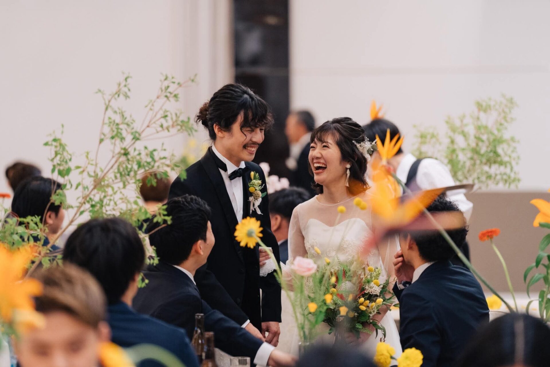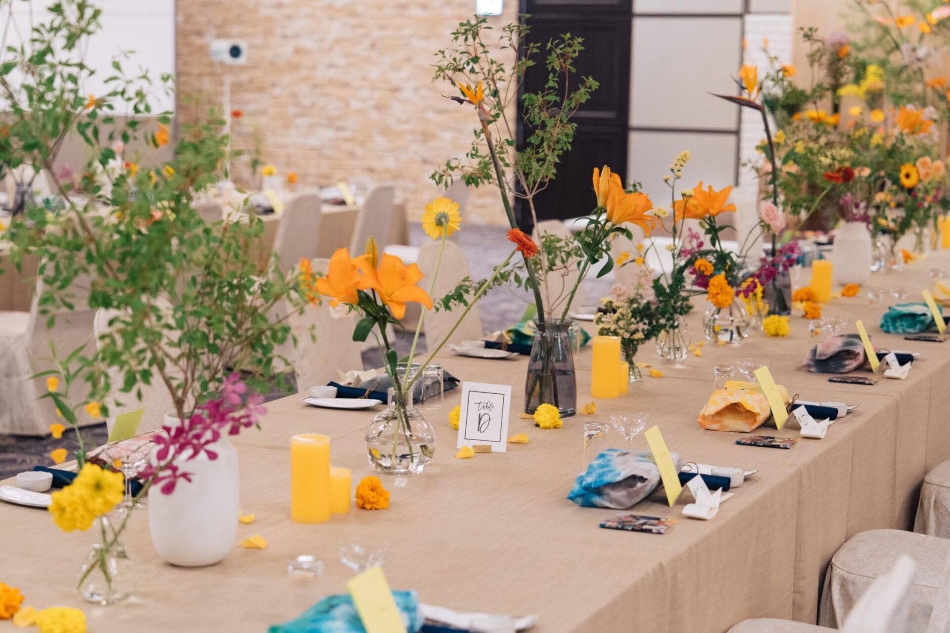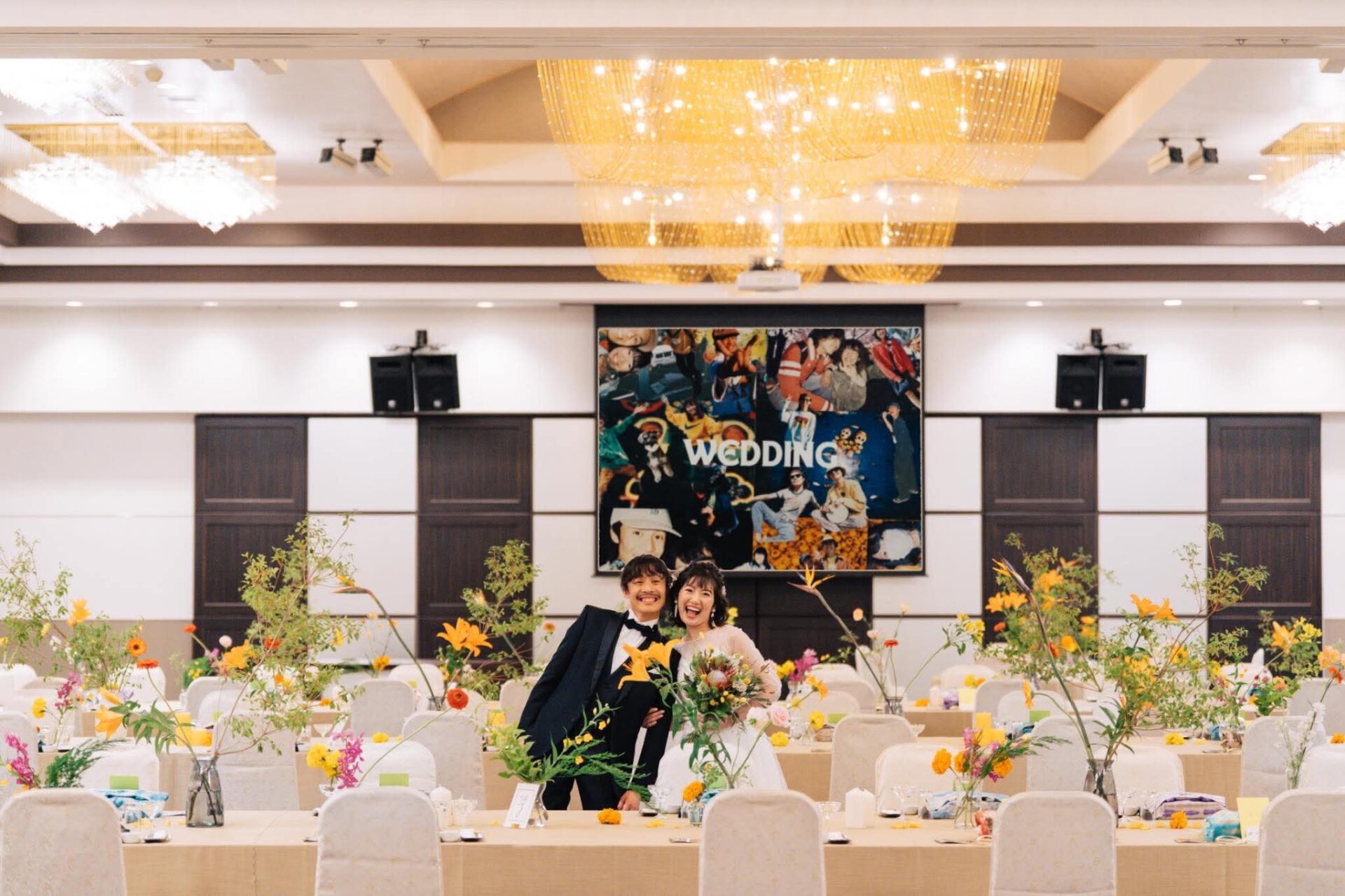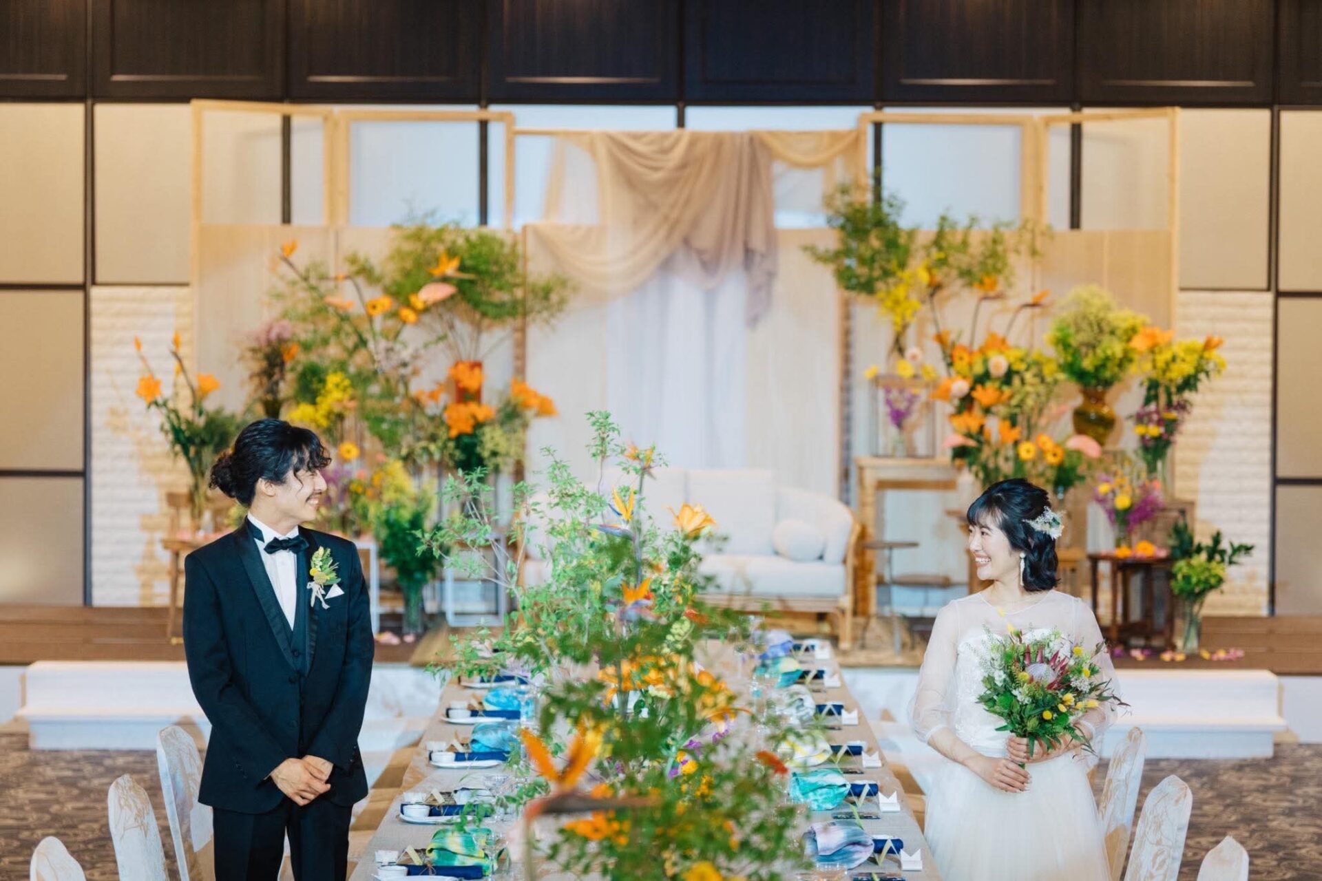 会場装飾はおふたりの好きなイエローとグリーンをベースに、パワーを感じるイメージにしています。